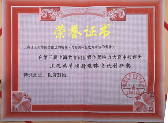 1月3日,由共青團(tuán)上海市委主辦,青春上海媒體中心、上海共青團(tuán)新媒體聯(lián)盟承辦的第三屆上海共青團(tuán)新媒體影響力大賽決賽暨頒獎(jiǎng)儀式在上海世博會博物館WE劇場舉行。由我校團(tuán)委愛思新媒體中心報(bào)送的原創(chuàng)動畫短片《與愛思一起成為身邊的雷鋒》榮獲“飛躍創(chuàng)新獎(jiǎng)”。