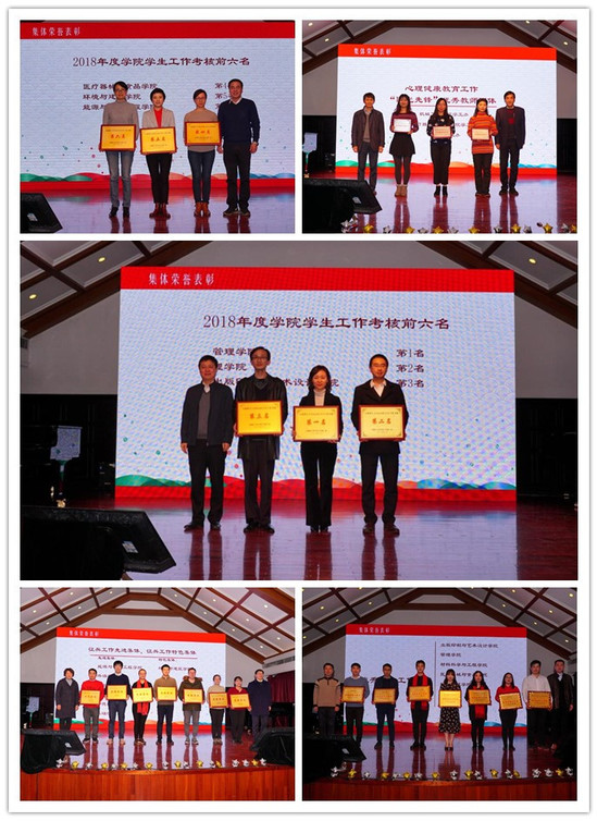 丁曉東、盛春為2018年度學(xué)院學(xué)生工作考核前六名——管理學(xué)院、理學(xué)院、出版印刷與藝術(shù)設(shè)計學(xué)院、醫(yī)療器械與食品學(xué)院、環(huán)境與建筑學(xué)院以及能源動力與工程學(xué)院頒發(fā)榮譽(yù)獎牌。與會職能部處領(lǐng)導(dǎo)為2018年表現(xiàn)突出的專項工作優(yōu)秀集體頒發(fā)榮譽(yù)獎牌。表現(xiàn)突出的個人及其榮譽(yù)也在四季篇章里以視頻形式全部進(jìn)行了展示。交流會末尾,“四季之歌”奉獻(xiàn)“彩蛋”,盛春向每個學(xué)院贈送親筆簽寫寄語的合影照片,勉勵全體學(xué)工人在2019年為上理做更美好的事,在上理遇見更美好的自己,并傳達(dá)了校黨委書記吳松對全體學(xué)工人的感謝和祝福。