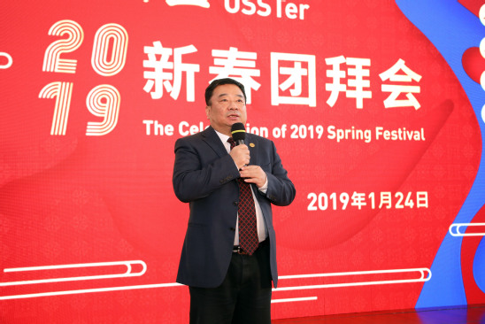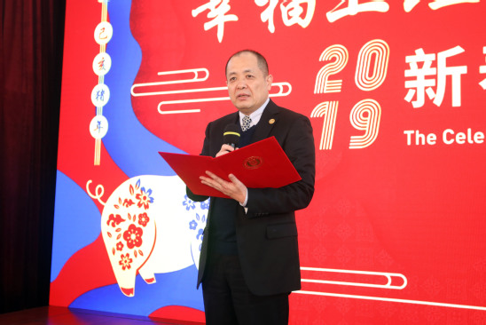 黨委書記吳松代表學(xué)校致新春賀辭。他首先向各級(jí)領(lǐng)導(dǎo)、合作單位、離退休老領(lǐng)導(dǎo)、老同志、海內(nèi)外校友以及長(zhǎng)期以來(lái)關(guān)心支持學(xué)校發(fā)展的各屆朋友,向團(tuán)結(jié)奮斗的全校師生員工表示衷心的感謝。他指出,2018年,是上海理工大學(xué)發(fā)展歷程中極不平凡的一年,上理人用不懈的奮斗,收獲了豐碩的成果,也收獲了滿滿的幸福。全校上下以習(xí)近平新時(shí)代中國(guó)特色社會(huì)主義思想和黨的十九大精神為指引,貫徹落實(shí)全國(guó)教育大會(huì)精神,按照學(xué)校第八次黨代會(huì)的部署,全面推進(jìn)高水平大學(xué)建設(shè),不斷開(kāi)創(chuàng)事業(yè)發(fā)展的新局面。在展望2019年工作時(shí),吳松強(qiáng)調(diào),“船到中流浪更急,人到半山路更陡”,2019年的建設(shè)與發(fā)展的任務(wù)更加艱巨,全校上下更應(yīng)當(dāng)緊密團(tuán)結(jié)、齊心合力、攻堅(jiān)克難,力爭(zhēng)取得更大成績(jī)。吳松攜全體校領(lǐng)導(dǎo)走上舞臺(tái),向所有來(lái)賓、全校師生、海內(nèi)外校友、各界朋友拜年,向大家致以誠(chéng)摯的新春祝福。