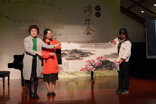 詩樂會(huì)上,王麗紅老師、董劍戟老師還將現(xiàn)場所創(chuàng)作的國畫和書法作品饋贈(zèng)給了滬江學(xué)院。滬江學(xué)院直屬黨支部書記、常務(wù)副院長陳紅接受了饋贈(zèng)。