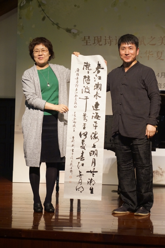 本次滬江詩樂會(huì)精選了《周南·關(guān)雎》、《上邪》、《楓橋夜泊》、《卜算子·我住長江頭》和《春江花月夜》等五首古詩詞,涵蓋了《詩經(jīng)》、漢樂府、唐詩、宋詞等不同的詩歌體裁。劉永老師從中國傳統(tǒng)文化的深厚背景出發(fā),對(duì)每一首詩詞的深刻內(nèi)涵作了深度解讀,并講解了有關(guān)詩詞吟誦的基本規(guī)則和方法,現(xiàn)場展示了詩詞吟誦;周燕燕老師則為大家演唱了這幾首古詩詞藝術(shù)歌曲,通過她的演繹,讓大家對(duì)詩詞所表達(dá)的內(nèi)涵,有了更深刻、更直觀的感悟;張宇迪老師從音樂的角度,為大家介紹了藝術(shù)歌曲的起源與藝術(shù)特點(diǎn),以及中國藝術(shù)歌曲的發(fā)展脈絡(luò)和審美特征。整場詩樂會(huì)在對(duì)于《春江花月夜》的演繹中達(dá)到了高潮。在對(duì)這首詩的闡釋、吟誦及根據(jù)這首詩進(jìn)行改編的藝術(shù)歌曲的演繹中,王麗紅老師現(xiàn)場作畫,董劍戟老師現(xiàn)場書寫,中西五種藝術(shù)形式進(jìn)行了完美結(jié)合,聽眾也在整個(gè)過程中獲得了對(duì)中國古典詩歌的全新的和全面的體驗(yàn)。