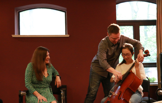 5月30日下午,Dianna Anderson及Erik Anderson還與同學(xué)們?cè)诿绹幕涣髦行拈_展了交流活動(dòng)。兩位音樂家對(duì)同學(xué)們的提問耐心地一一作答。Erik Anderosn在交流會(huì)上拉起大提琴,向同學(xué)們展示了大提琴的魅力。Dianna Anderson還應(yīng)同學(xué)們的要求,和著大提琴低沉婉轉(zhuǎn)的音色歌唱。在一片歡聲笑語之中,交流會(huì)活動(dòng)圓滿結(jié)束。