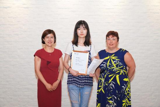 劉芹教授和Andrea Ward女士為陳今亮同學(xué)(中)頒發(fā)獎學(xué)金證書