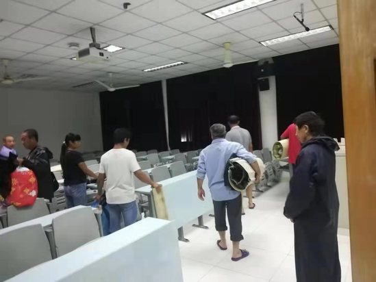 在后勤管理處設(shè)置值班室,生樂(lè)物業(yè)、東方大學(xué)城物業(yè)經(jīng)理24小時(shí)在崗值班,后勤應(yīng)急搶險(xiǎn)人員隨時(shí)待命。值班人員分校區(qū)、分區(qū)域每2小時(shí)對(duì)校園巡視一次。及時(shí)處置傾倒樹(shù)木6株,扶正桂花、海棠等樹(shù)木12棵,清掃道路,疏通雨水井。安排400余名施工工人到第四教學(xué)樓、體育活動(dòng)中心臨時(shí)休息,確保施工人員安全。