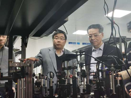 圖為莊松林(右)與詹其文(左)在實(shí)驗(yàn)平臺(tái)前展示颶風(fēng)光場(chǎng)。王燁捷攝