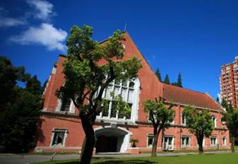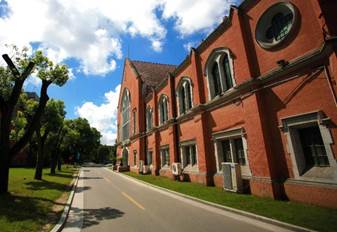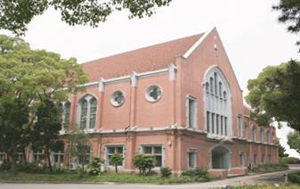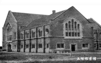 大禮堂與思魏堂為磚混結(jié)構(gòu)建筑,學(xué)院哥特式風(fēng)格。建筑立面上鑲嵌簡化的哥特式十字花窗和尖券窗,窗洞用細(xì)柱分成豎向長窗,增強(qiáng)了垂直感和立體感。建筑入口是厚墻線腳和雙聯(lián)扁平拱門洞。