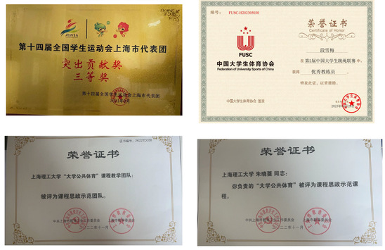 以學(xué)生為中心,滿足學(xué)生個(gè)性化需求,大膽進(jìn)行體育教學(xué)改革,通過“以賽代課”“以賽促練”,打造足球、籃球、排球、羽毛球等10余項(xiàng)目的競賽課程,開設(shè)健康促進(jìn)課、保健課、健康減脂課、人文素養(yǎng)課等,營造良好的體育氛圍,引導(dǎo)學(xué)生主動(dòng)鍛煉,關(guān)注身心健康,養(yǎng)成運(yùn)動(dòng)習(xí)慣,培養(yǎng)學(xué)生終身體育意識(shí)。《大學(xué)公共體育》獲得了上海市課程思政示范課和示范團(tuán)隊(duì)榮譽(yù)稱號(hào),并獲得了第十四屆全國學(xué)生運(yùn)動(dòng)會(huì)上海市代表團(tuán)突出貢獻(xiàn)獎(jiǎng)三等獎(jiǎng)。