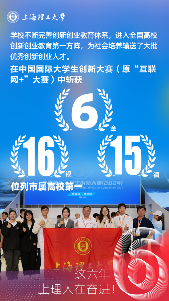 這六年,上海理工大學不斷完善創(chuàng)新創(chuàng)業(yè)教育體系,進入全國高校創(chuàng)新創(chuàng)業(yè)教育“第一方陣”,為社會培養(yǎng)輸送了大批優(yōu)秀創(chuàng)新創(chuàng)業(yè)人才。在中國國際大學生創(chuàng)新大賽(原“互聯(lián)網(wǎng)+”大賽)中斬獲6金、16銀、15銅,位列市屬高校第一。