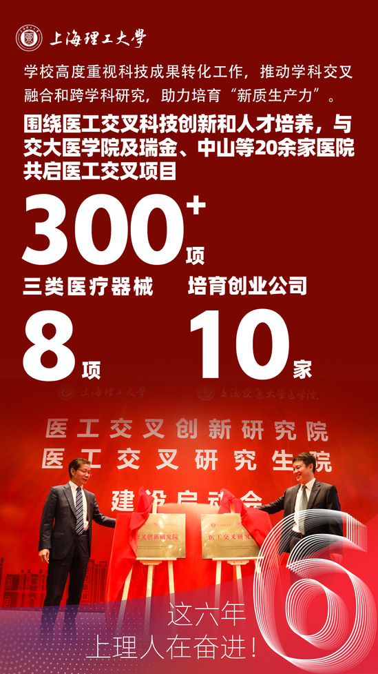 這六年,上海理工大學(xué)高度重視科技成果轉(zhuǎn)化工作,推動學(xué)科交叉融合和跨學(xué)科研究,助力培育“新質(zhì)生產(chǎn)力”。圍繞醫(yī)工交叉科技創(chuàng)新和人才培養(yǎng),與交大醫(yī)學(xué)院及瑞金、中山等20余家醫(yī)院共啟醫(yī)工交叉項目300余項,申請三類醫(yī)療器械8項,培育創(chuàng)業(yè)公司10家。