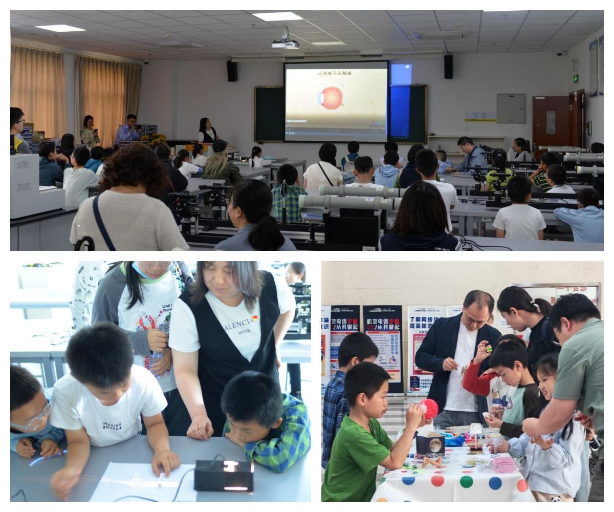 在光電信息實(shí)驗(yàn)中心教師志愿者的引導(dǎo)下,大家有序參觀了本科實(shí)驗(yàn)教學(xué)中心。在方寶英老師的指導(dǎo)下,小朋友們進(jìn)行了“近視眼和遠(yuǎn)視眼的形成及其矯正”光學(xué)趣味小實(shí)驗(yàn)。小朋友們不僅輕松理解了光學(xué)矯正的原理,更深刻意識(shí)到保護(hù)視力的重要性。此外,“顯微鏡”“潛望鏡”“投影燈”“臺(tái)燈”等生活中常見(jiàn)物品的光學(xué)原理探究活動(dòng),小朋友們通過(guò)動(dòng)手組裝直觀感受到光學(xué)反射、折射原理在日常生活中的應(yīng)用,鍛煉了動(dòng)手能力和創(chuàng)造力,深刻體會(huì)到了“科技讓生活更美好”的真諦。