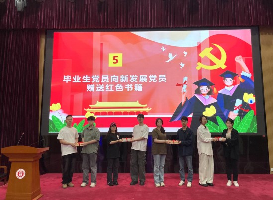 畢業(yè)生黨員向結(jié)對的新發(fā)展黨員贈送紅色書籍。一本本承載著紅色精神的書籍,傳遞的不僅是知識,更是紅色基因的傳承與接力。希望新發(fā)展黨員能從書中汲取力量,堅(jiān)定理想信念,走好新時代的長征路。