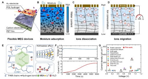 研究團(tuán)隊(duì)提出了一種基于PGL水凝膠的濕度發(fā)電機(jī),通過實(shí)驗(yàn)和分子模擬驗(yàn)證了其高效的工作機(jī)制,以準(zhǔn)確預(yù)測(cè)PMEG的性能并指導(dǎo)其優(yōu)化設(shè)計(jì)。該器件在30 °C、80 %RH條件下實(shí)現(xiàn)0.6 V開路電壓與0.58 mA cm?2短路電流,單單元輸出功率即可媲美以往數(shù)百單元并聯(lián)水平。多物理場耦合模型首次將“化學(xué)—傳質(zhì)—電場”統(tǒng)一,實(shí)現(xiàn)性能預(yù)測(cè)與材料反向設(shè)計(jì),為自供能柔性電子提供了一條可擴(kuò)展、低成本、高功率的濕電技術(shù)路線。