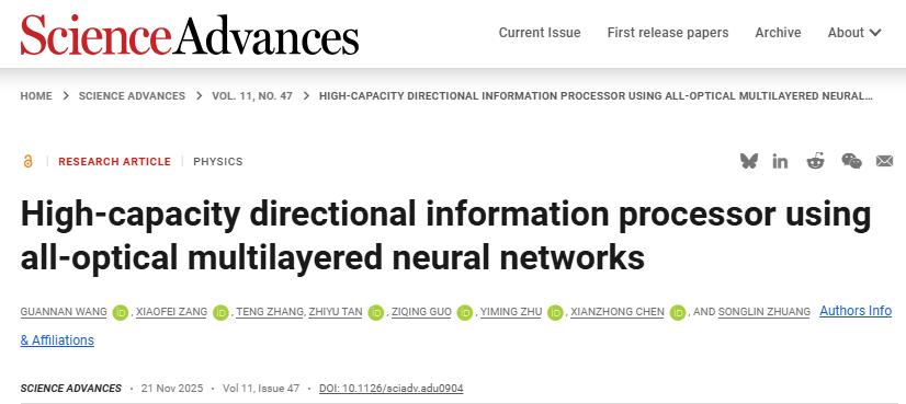 近日,上海理工大學(xué)莊松林院士領(lǐng)導(dǎo)的太赫茲技術(shù)創(chuàng)新團(tuán)隊臧小飛教授、朱亦鳴教授聯(lián)合英國赫瑞瓦特大學(xué)陳獻(xiàn)忠教授課題組,提出了一種新穎的方向性衍射神經(jīng)網(wǎng)絡(luò)(D-D2NN)架構(gòu)?;谧孕怦钚统瑯?gòu)表面的鏡像雙極性特性,通過聯(lián)合改變光的傳播方向和多層超構(gòu)表面的層間距,實現(xiàn)了在傳播方向上的多功能全光智能信息處理。研究成果以“方向性全光衍射處理器”(High-capacity directional information processor using all-optical multilayered neural networks)為題發(fā)表于《科學(xué)進(jìn)展》(Science Advances),碩士生王冠南為第一作者,臧小飛教授、朱亦鳴教授、陳獻(xiàn)忠教授為通訊作者,上海理工大學(xué)為第一單位。